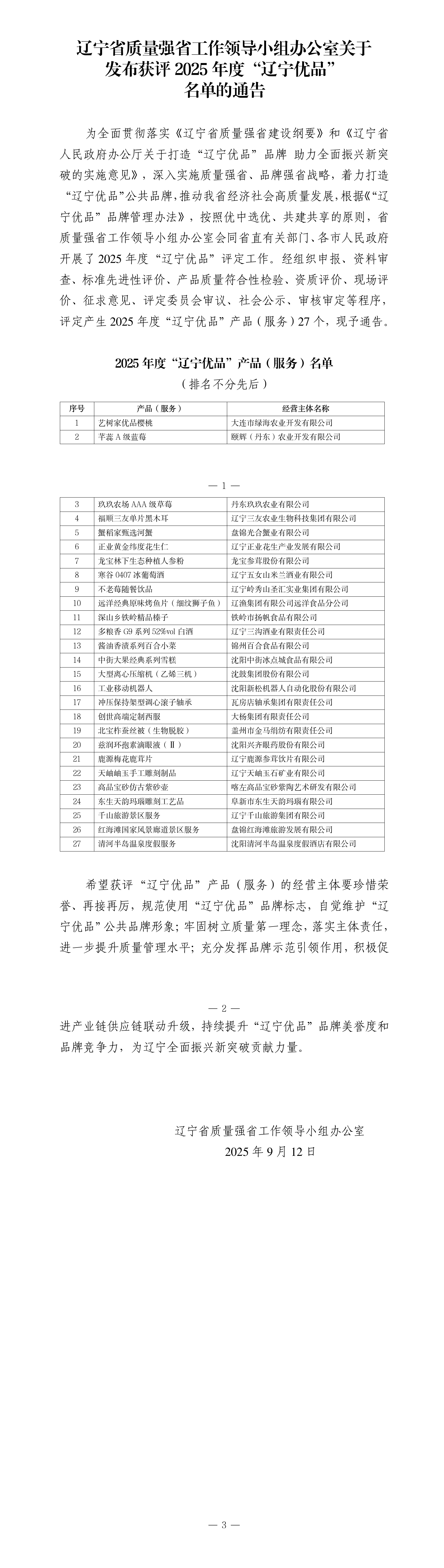 辽宁省质量强省工作领导小组办公室关于发布获评2025年度“辽宁优品” 名单的通告